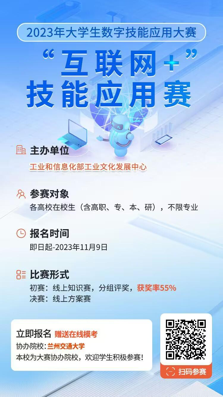 为贯彻习总书记在二十大报告中关于“实施国家文化数字化战略”以及“加快发展数字经济,促进数字经济和实体经济深度融合,打造具有国际竞争力的数字产业集群”等讲话精神,引导、培养广大在校大学生的各类计算机技能应用能力,激发大学生创新意识,增强创新思维能力,促进学生的全面发展,提高未来就业优势,现组织兰州交通大学学子参加2023大学生数字技能应用大赛互联网+技能应用赛,相关事宜安排如下: