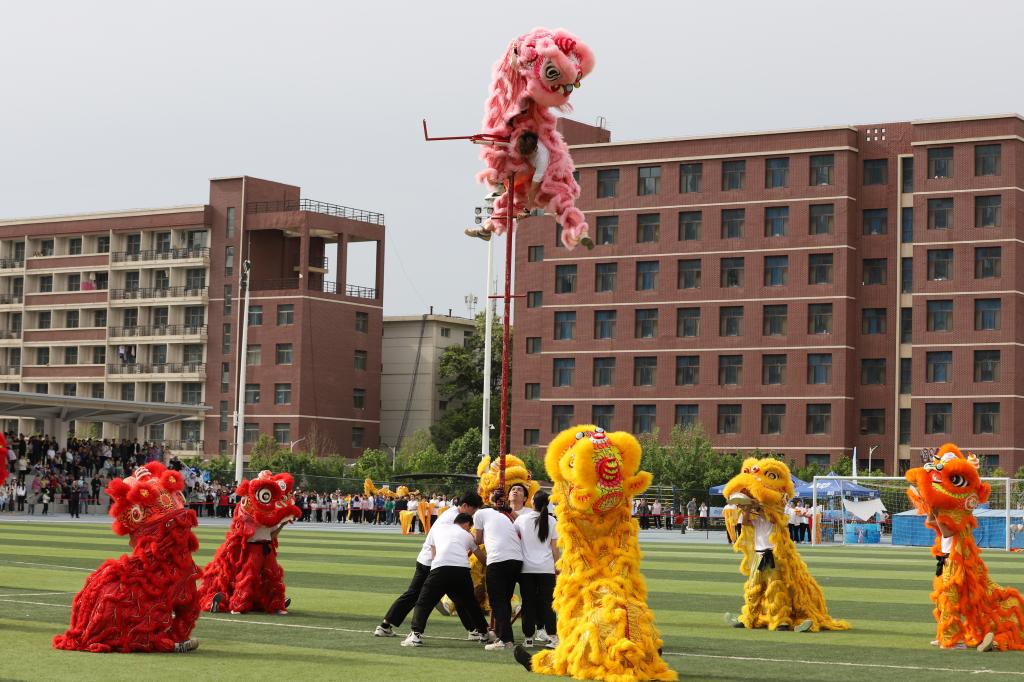 大学生体育教学成果展示环节将开幕式气氛推向高潮。八只栩栩如生的狮子踏着醒狮鼓乐在操场上腾跃翻滚,引来阵阵喝彩。初级剑术方阵如银龙出水,寒光交错间,“提膝劈剑”动作带动剑穗扬起统一弧线,金属震颤声与太极背景乐形成奇妙共振。功夫扇方阵从四面席卷而来,学生们手持彩色功夫扇,随着音乐的节奏翩翩起舞。他们时而翻飞扇子,时而挥扇如风,动作整齐划一,气势磅礴,随着他们的舞动,扇面上的图案在阳光下熠熠生辉,令人目不暇接。参加表演的学生热情洋溢,用灵动的身姿和饱满的热情,将力与美、传统与现代巧妙结合,展现了青年学子蓬勃向上的朝气,将学校特色体育教学成果体现得淋漓尽致。