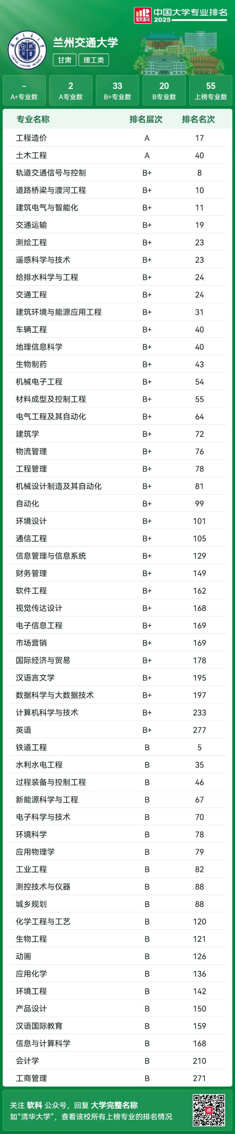 6月18日,高等教育专业评价机构软科正式发布2025“软科中国大学专业排名”。本次排名包括836个本科专业,共有1110所高校的30930个专业点上榜。我校共55个专业上榜,其中土木工程和工程造价专业排名A层次,轨道交通信号与控制等33个专业排名B+层次,B+以上上榜专业数居省属理工类高校首位,专业整体评级呈上升趋势。