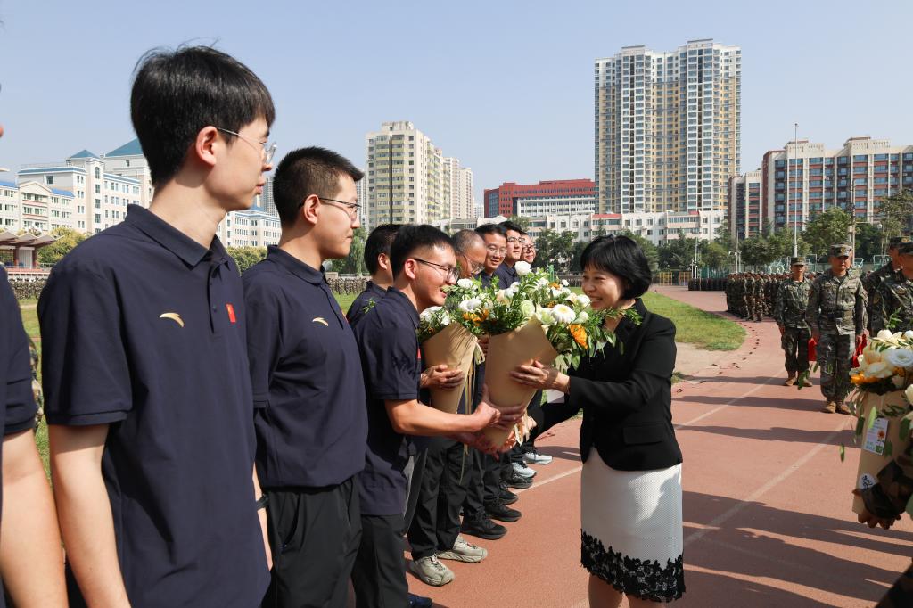 随后,聂磊向训练中的新生们送上鼓励。她寄语全体新生要珍惜军训这一难得的锻炼机会,克服高温天气等困难挑战,以不怕苦、不怕累的精神投入训练,在严格的军事训练中增强国防观念、锤炼过硬作风、提升团队协作能力,为开启充实而有意义的大学生活奠定坚实基础。