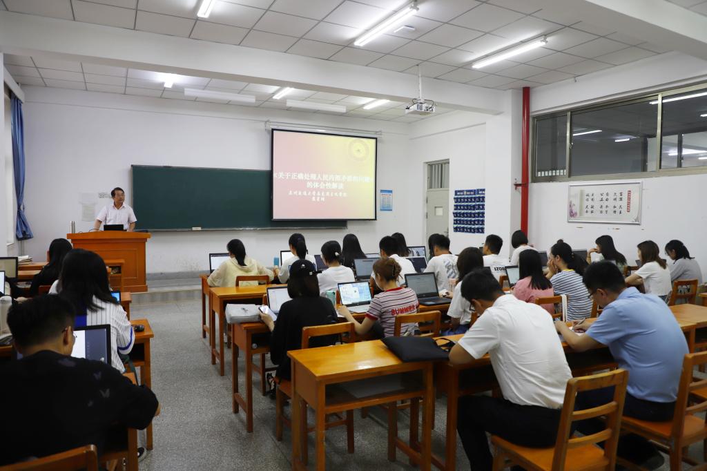 课堂上,苏星鸿老师解读了毛泽东《关于正确处理人民内部矛盾的问题》文献,他从时代背景、主要论点、现实意义三个方面对该文献进行详细阐释和解读。贡力认真听取并详细了解该课程的教学过程、授课方法和学生们的学习情况,并进行了相关记录和客观评价。