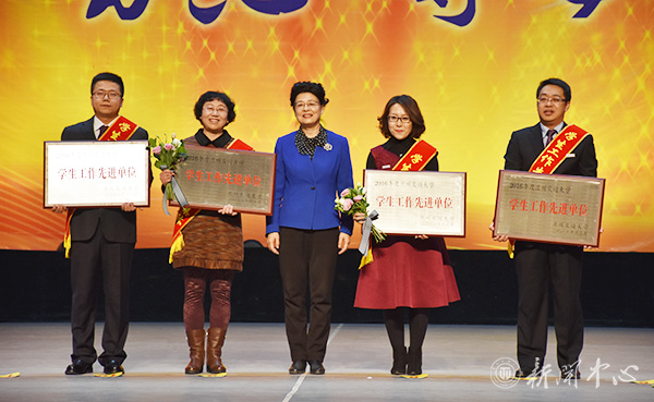 副校长马军党代表学校党委、行政发表了热情洋溢的讲话,向受到表彰奖励的先进集体和个人表示热烈的祝贺,向辛勤耕耘在学生工作一线的所有老师和学生骨干表示衷心的感谢。马军党副校长充分肯定了全校学生工作人员在学生教育管理、招生就业、团学活动、大学生创新创业等方面所做的扎实且富有特色的工作。马军党副校长向全体学生工作人员提出三点希望和要求:坚持“立德树人”的根本要求,开创学生工作新局面;夯实安全管理工作基础,确保学生健康成长;加强作风建设,全面提升工作水平。同时,也向全校青年学生提出三点希望:胸怀理想,志存高远;人才有高下,知物由学;认认真真做事,踏踏实实做人。希望受到表彰的先进集体和先进个人,更好地发挥示范引领作用,在成才报国的人生旅途上再创佳绩,再立新功。