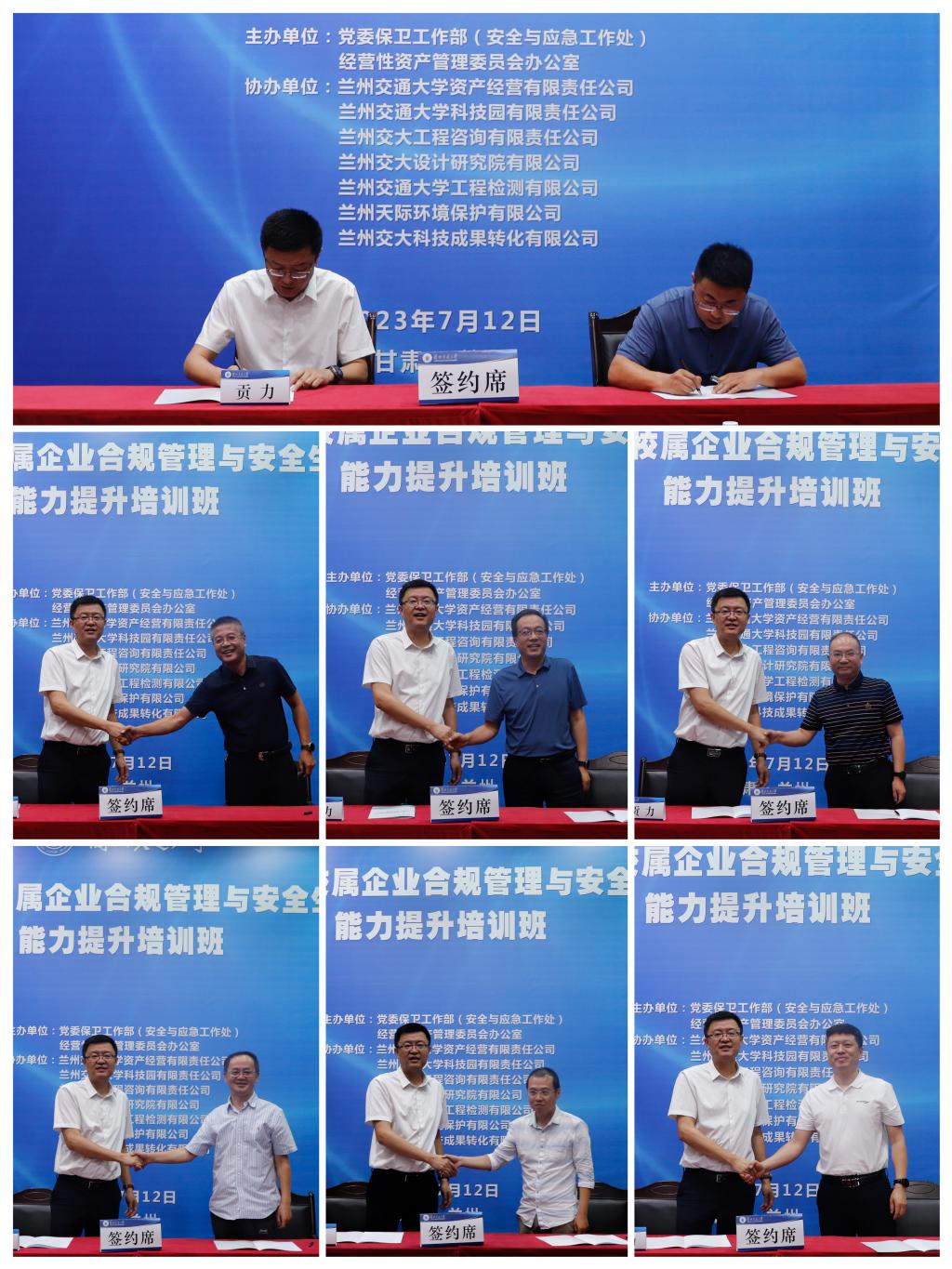 随后,贡力副校长代表学校与校属各全资及控股企业主要负责人签订《兰州交通大学校属企业2023年度安全生产责任书》,各企业主要负责人签署《兰州交通大学校属企业2023年度依法合规经营管理承诺书》,推动校属企业明确目标、靶向发力,切实担负起安全生产与合规管理的主体责任。