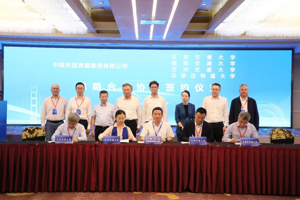 青藏集团公司与我校等4所铁路高校,铁科院等3个科研所,华为公司等6家合作单位签署了战略合作协议。随后在中国铁道学会理事长、中国工程院院士卢春房,国铁集团科技和信息化部主任周黎,中国铁路青藏集团公司党委书记、董事长郭吉安,青海省科协党组成员、副主席张晓蕾等领导的见证下,中国铁路青藏集团公司副总经理马殷军与我校副校长闫浩文签订了校企合作协议。