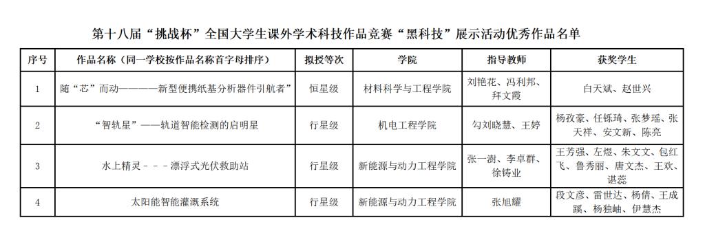 我校作品《绿能促双碳——光伏光热多能化智能烘干机》荣获主体赛道三等奖。“黑科技”展示活动中,作品《“随芯”而动——新型便携纸基分析器件引航者》被评定为“恒星”级;作品《“智轨星”——轨道智能检测的启明星》《水上精灵——漂浮式光伏救助站》《太阳能智能灌溉系统》被评定为“行星”级。