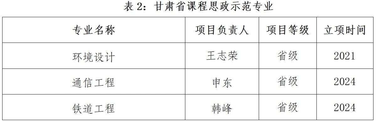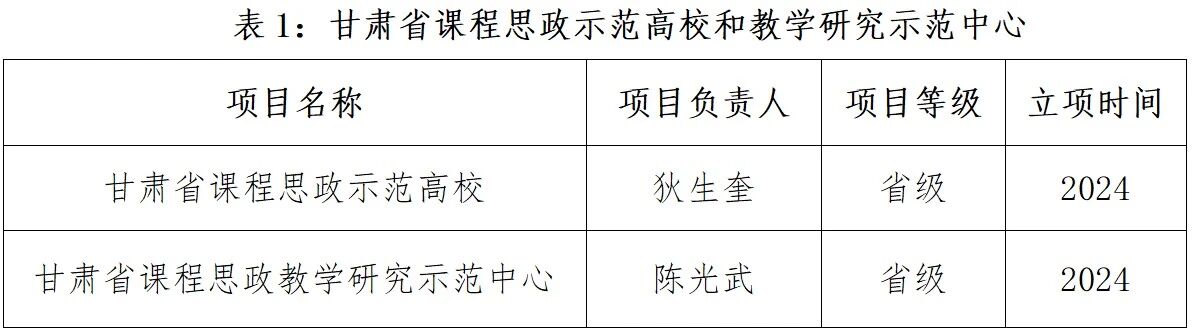 为扎实推进课程思政建设及教育教学改革,把思想政治教育贯穿于人才培养全过程,有效促进人才培养质量的全面提升,学校持续加强课程思政示范项目建设。近5年来,学校获批“甘肃省课程思政示范高校”,获批1个“甘肃省课程思政教学研究示范中心”,3个专业获批“甘肃省课程思政示范专业”,5门课程获批“甘肃省课程思政示范课程、教学名师和团队”,18个专业获批“校级课程思政示范专业”,75门课程获批“校级课程思政示范课程、教学名师和团队”,3个校级课程思政教学研究示范中心获批立项建设。