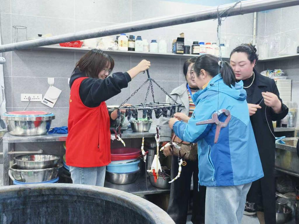 在互动体验环节,博物馆专业教师现场演示了扎染工艺的基本操作流程,从布料折叠、捆扎技巧到染色调配、固色处理,每一个步骤都讲解细致、操作规范。参训教师们热情高涨,纷纷动手参与实践,在专业指导下尝试制作属于自己的扎染作品。“以前只在教材里给学生讲过扎染,今天亲手操作才发现,折叠的角度、捆扎的松紧都会影响最终的图案效果,这种实践体验对今后教学太有帮助了!”来自天水市武山县的参训教师一边调整布料捆扎的力度,一边感慨道。现场氛围热烈,教师们相互探讨技巧、分享创作思路,在动手实践中深化了对染缬工艺的理解。