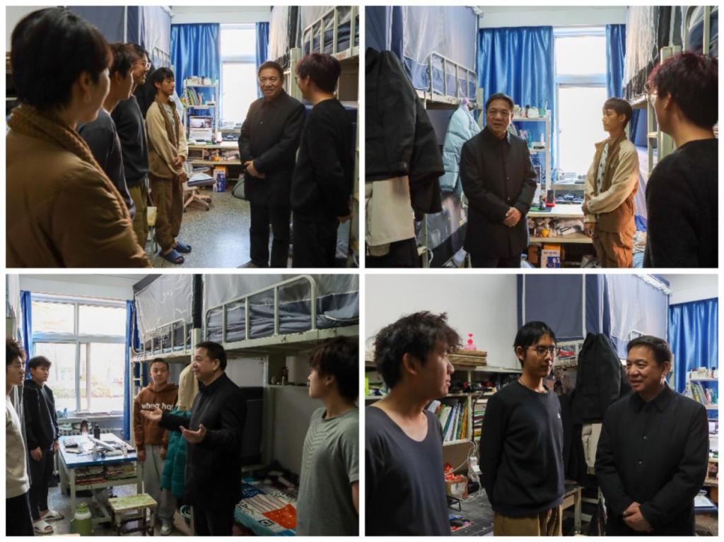 调研会后,朱廷珺在北苑四公寓开展“七进”工作,深入学生宿舍密切联系学生。他与同学们亲切交流,了解学生宿舍生活、用电安全、环境卫生、在校饮食、生活作息等情况,认真听取了同学们对学校教育教学、后勤服务保障等方面的建议和意见,对同学们在学习生活方面存在的疑惑予以现场解答,他指出,希望同学们珍惜宿舍情谊,发挥宿舍主阵地,让宿舍变“小家”,让同学变“亲人”。