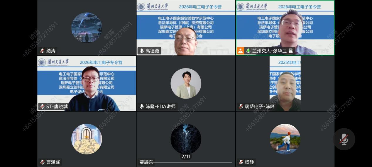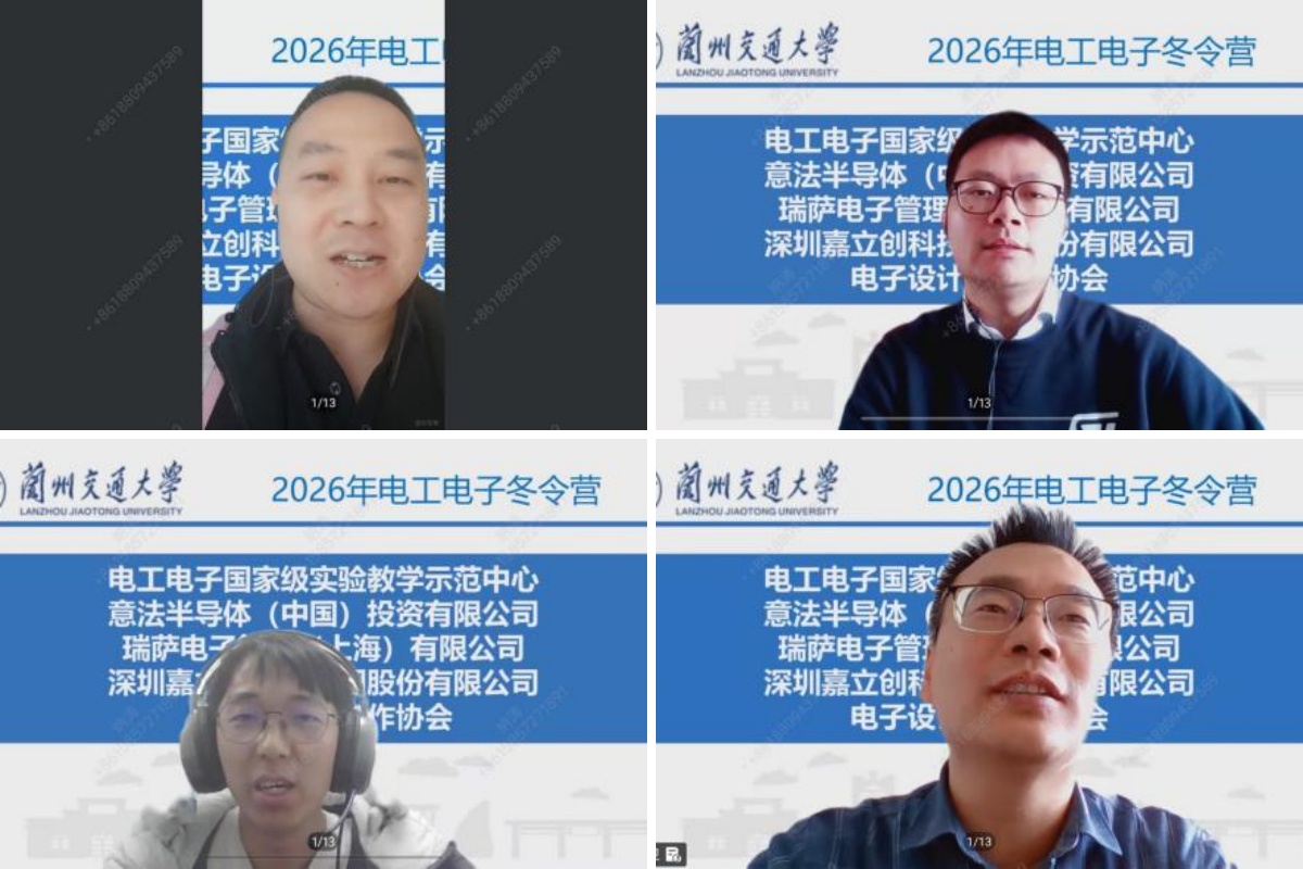 1月16日,兰州交通大学“电工电子助力成长”冬令营开幕式隆重举行,意法半导体(中国)投资有限公司院校合作经理唐晓城、瑞萨电子嵌入式处理器事业部高级经理陈峰、深圳嘉立创科技集团股份有限公司立创开源硬件创业扶持计划负责人陈隆、我校创新创业学院副院长高德勇、电工电子国家级实验教学示范中心副主任张华卫与参加本次冬令营的200余名同学齐聚云端,共同开启这场聚焦实践、赋能成长的科技研学之旅。