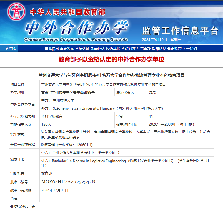持续整合国际合作资源,积极推进中外合作办学项目申报。历经多次尝试积累宝贵经验后,2025年9月,与匈牙利塞切尼·伊什特万大学合作举办的物流管理专业本科教育项目顺利获批。该项目的成功获批,实现了学校中外合作办学项目零的突破,是学校国际化办学的标志性成果,也是响应共建“一带一路”倡议、坚持对外开放办学的生动实践,更是学科特色赋能与协同机制保障下的重要成效。