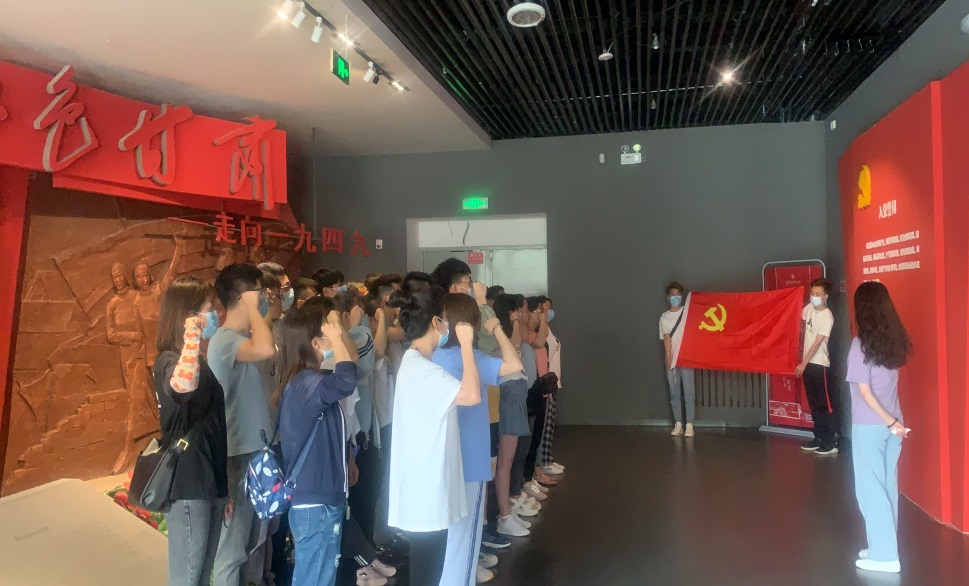 参观前,全体党员重温入党誓词,面对鲜红的党旗,大家郑重宣誓,句句铿锵有力。