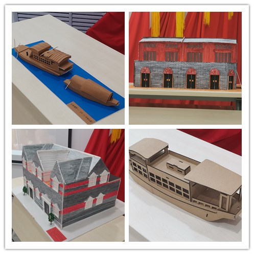 在比赛中进入决赛的八名同学,通过PPT展示了中国共产党的光辉历史,充分发挥个人的专业优势,介绍了红色建筑模型的历史背景、制作过程、方法以及理念。作品《红船》做工精细,采用实与虚的立体空间表达方式逼真还原了“一大”纪念船——“南湖红船”;作品《中共一大会址》以精美的雕刻、整体的协调引人注目;作品《中共四大会址》以KT板为材料,对四大原址进行复原和马克笔的填充;作品《中央红军长征出发纪念碑》以PVC板为主要材料,按照一定的比例尺寸来设计,给人一种雄伟、雄壮之感。