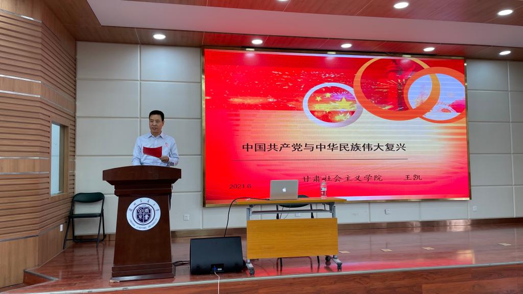 6月18日,经管学院在二教报告厅举办党史学习教育专题学习会暨《中国共产党与中华民族伟大复兴》讲座。邀请甘肃省社会主义学院副教授、甘肃省共青团青年宣讲团成员王凯博士作报告。学院党委书记孙珍寿主持,全体师生党员、积极分子约300余人参加。