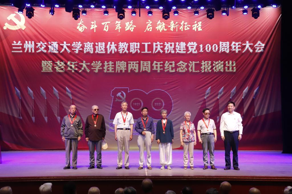 6月10日下午,由兰州交通大学离退休教职工党委、离退休教职工服务中心和老年大学共同举办的离退休教职工庆祝建党一百周年大会暨老年大学挂牌两周年纪念汇报演出在学校大礼堂举行。校党委书记杨子江、副书记买寿清、副校长朱廷珺出席大会。省委老干部局一级调研员侯耀升,教育厅老干部处处长王筱亭,以及来自省内兄弟院校的老干部工作负责人到场祝贺。学校相关部门负责人,500余名离退休教职工参加庆祝活动。