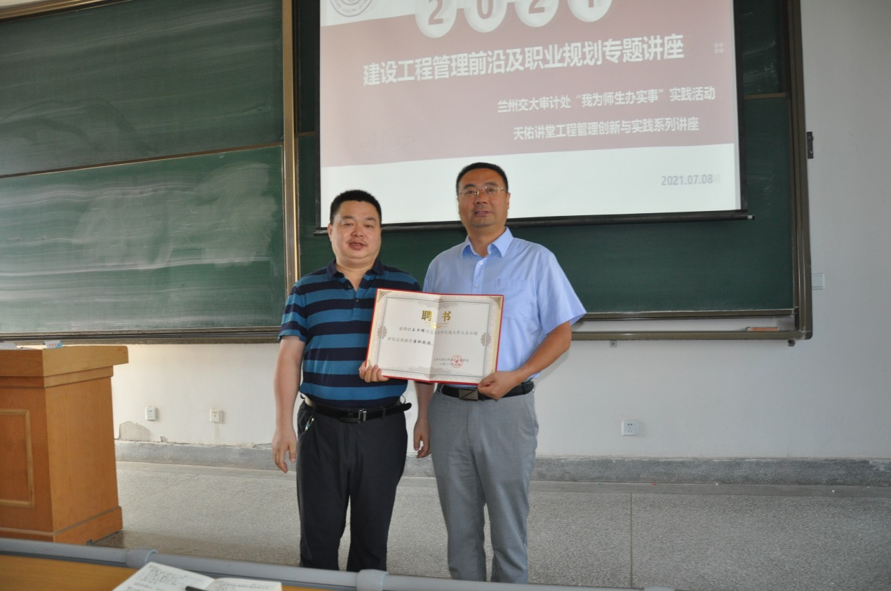 根据学校党史学习教育工作安排,审计处党支部积极开展“我为师生办实事”实践活动。于2021年7月8日上午1教2403阶梯教室,由审计处党支部牵头组织、联合土木工程学院天佑讲堂“工程管理创新与实践系列讲座”活动,邀请中维信达项目管理公司王平辉董事长做了题为“建设工程管理前沿及职业规划”专题讲座,并由土木工程学院韩峰副院长为王平辉董事长颁发“兰州交通大学土木工程学院实践教学兼职教授”聘任证书。兰州交通大学土木工程学院、审计处相关老师,工程管理、工程造价专业全体学生参加了讲座。