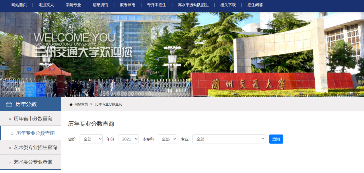 为便于广大考生查询我校历年录取情况,我校本专科招生网专门开辟了“历年分数”查询栏目,汇集了近年我校在全国招生录取投档分、各专业录取分及对应位次,以方便广大考生填报志愿时参考使用。同时,兰州交通大学招生官微已开通运营,将第一时间推送招生信息及招生动态,为广大考生报考我校提供便捷服务。