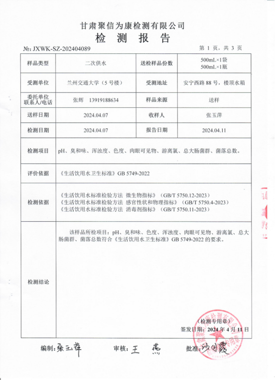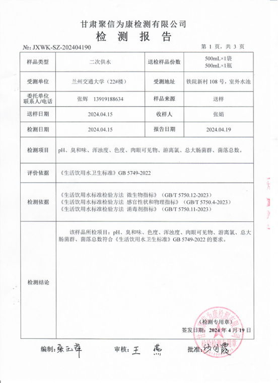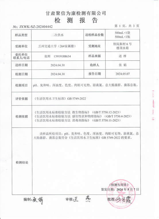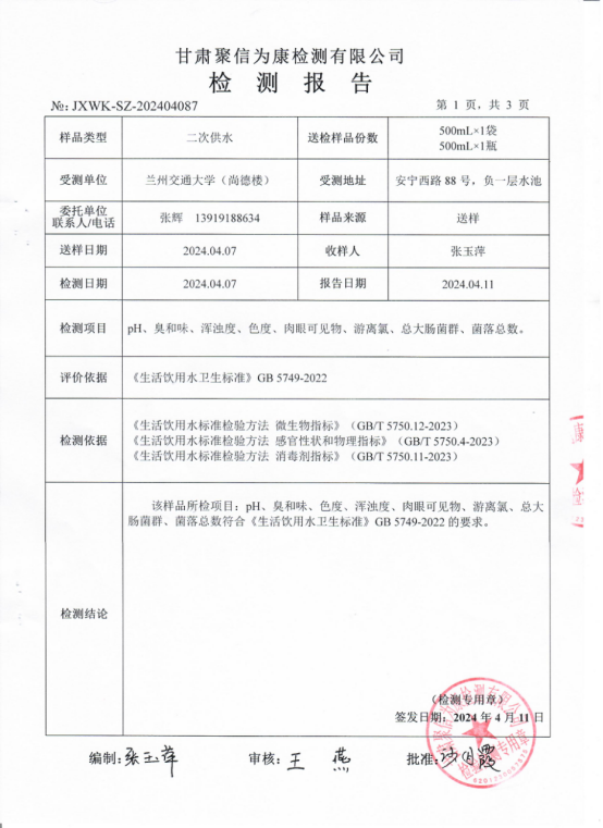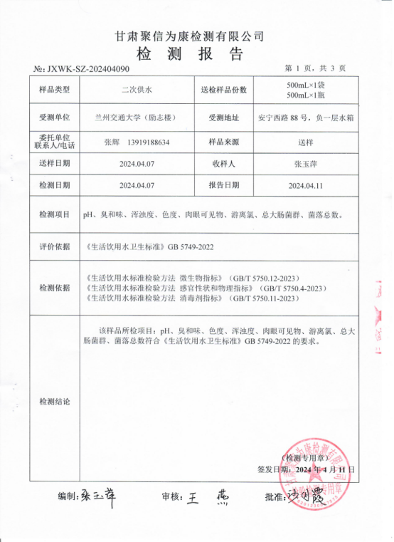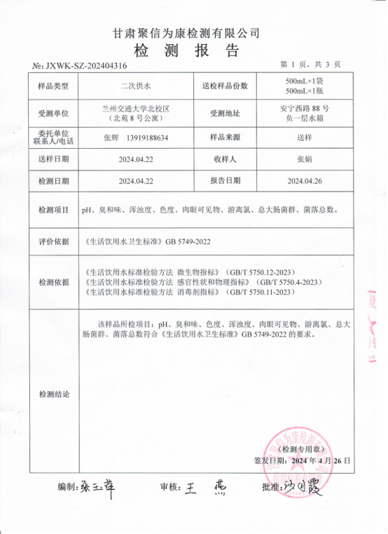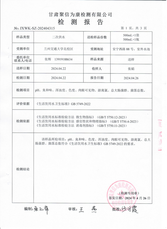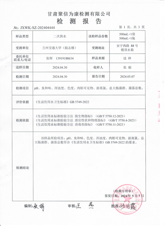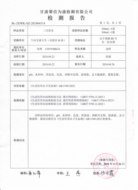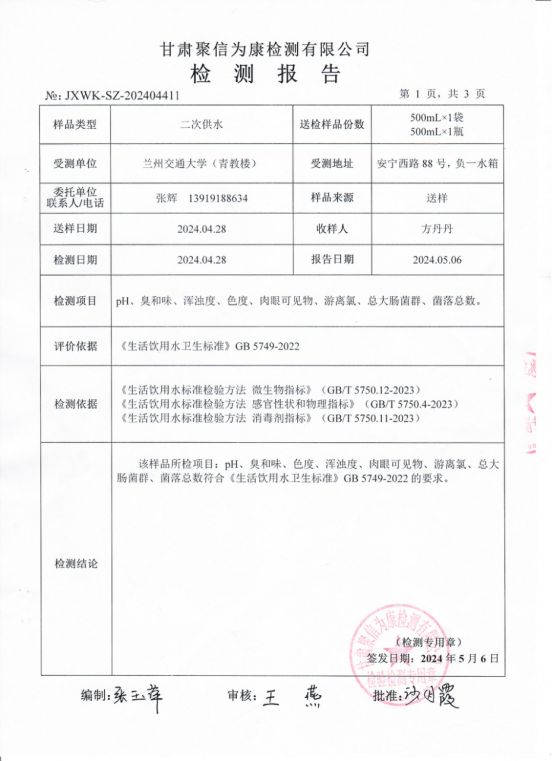 根据安宁区卫生健康局对二次供水设施需定期清洗消毒的规定要求,学校后勤保障部委托兰州泽锐供水服务有限公司于2024年4月6日至4月27日期间,利用双休日分时、分片区停水,并按照行业严格程序对学校大小16个蓄水池(水箱)进行了本年度上半年的清洗消毒工作,清洗后对各水库(水箱)水质进行抽样检验,检验结果均为“样品所检项目:PH、臭和味、色度、浑浊度、肉眼可见物、游离氯、总大肠菌群、菌落总数符合《生活饮用水卫生标准》GB5749-2022的要求”。现对相关清洗及抽样检验结果予以公示。