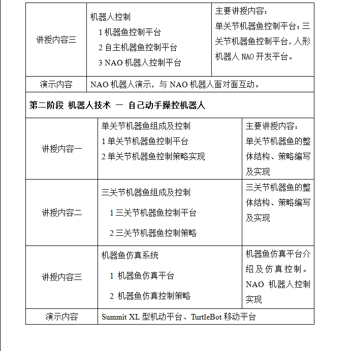 3. 5月13日-5月30日:以三关节仿生机器鱼、单关节仿生机器鱼、人形机器人NAO、自主移动机器人SUMMIT XL、TurtleBot、以及“探索者”机器人创新套件等平台为基础,进行机器人操作和应用能力训练,以及控制算法的编写与验证;并进行第二阶段考核,确定第三阶段入围名单;