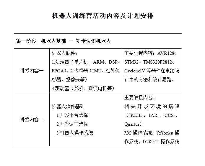 2. 4月5日-5月10日:进行机器人基础知识培训,包括简易控制系统电路板制作、调试和简单功能实现;以及相关编程语言讲解,并进行第一阶段考核;确定第二阶段入围名单;