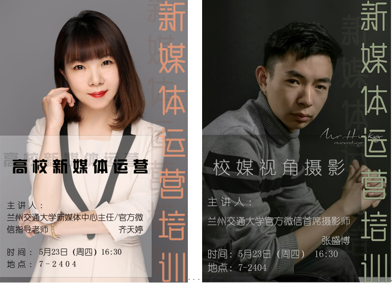 为顺应新时代高校宣传工作的开展,规范学校新媒体宣传、引导、教育与服务等方面的工作,兰州交通大学新媒体中心将于5月23日(本周四)下午16:30在第七教学楼2404举办“高校新媒体运营”及“校媒视角摄影”培训,欢迎各部处、学院从事新闻宣传报道工作的师生参与交流。
