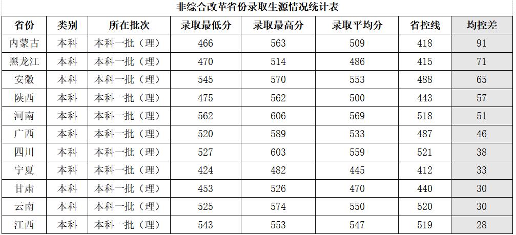 在全国17个非高考改革省份,我校录取情况总体上保持稳定态势,尤其是在12个一本招生省份(其中6个省份全部专业一本招生,6个省份部分优势特色专业一本招生),生源质量持续向好。如内蒙古、黑龙江、安徽、陕西、河南等省份,本科一批(理)批次的录取平均分均高出当地一本省控线50分以上。