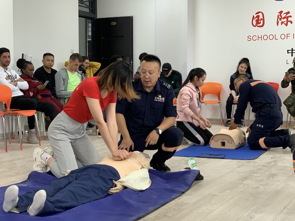 活动中,来自甘肃省方舟救援队的四名专业救援教官分别向来华留学生讲解了防踩踏身姿、密集人群拥挤防护、地震火灾逃生技巧、灭火器使用方法、心肺复苏技能以及伤口包扎术等安全常识。到场的来华留学生认真听取了教官们的专业讲解,并在教官的带领下现场实践演练各种实操技巧和动作规范。
