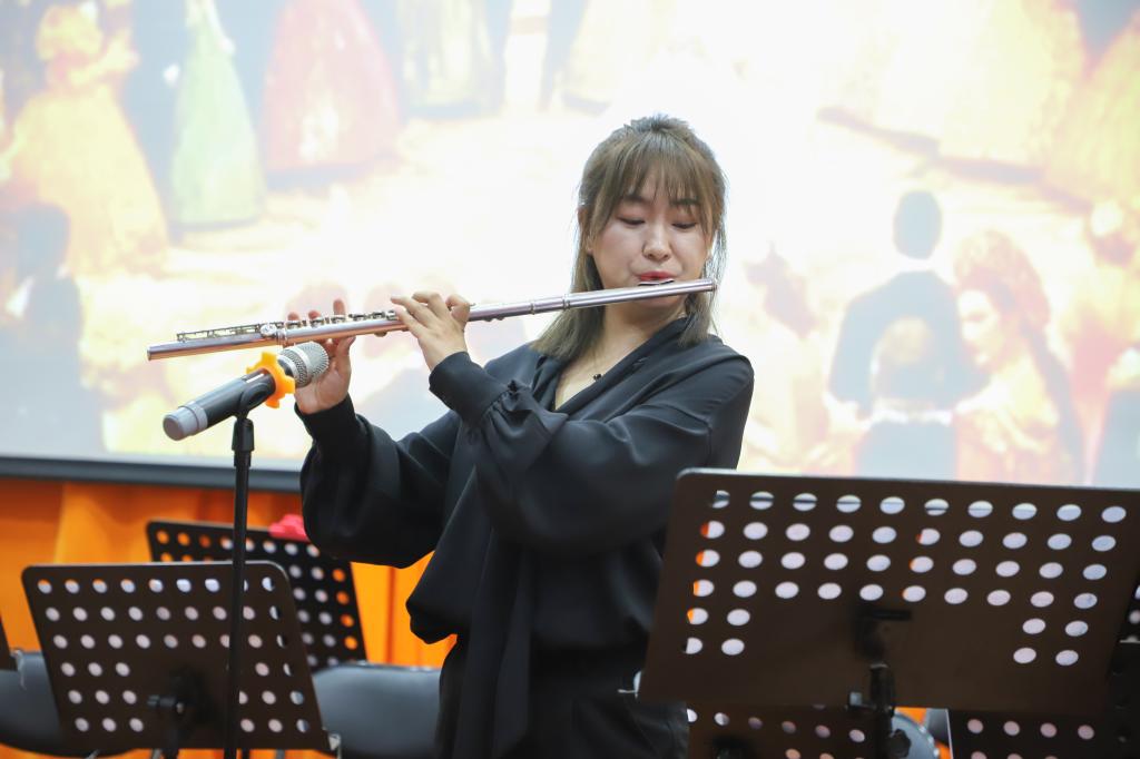 音乐会以一曲饱含深情的管乐合奏《我的祖国》开场,随后管乐团的大学生乐手和乐团指导教师们又联袂演奏了管乐合奏《狮子王》、萨克斯五重奏《悬崖上的金鱼公主》、萨克斯独奏《名侦探柯南》主题曲《如果有你》、长笛重奏《大鱼》、萨克斯独奏《seniorita》、单簧管重奏《千与千寻》、长笛重奏《mojito》等脍炙人口的曲目。乐团指导教师、青年演奏家杨哲老师演奏了宛转悠扬的小号独奏《绿岛小夜曲》,乐团常任指挥、青年演奏家张国斌老师为在场观众演奏了欢快动感的单簧管独奏《波卡尔》,乐团指导教师、青年演奏家吴婧老师演奏了热情奔放的长笛独奏《自由探戈》。全体乐团指导教师共同演奏了经典的管乐重奏《第二爵士圆舞曲》。最后,音乐会在管乐合奏《不忘初心》和《没有共产党就没有新中国》两首经典主旋律乐曲中。整场音乐会热情洋溢,娓娓动听,现场气氛热烈,高潮迭起。