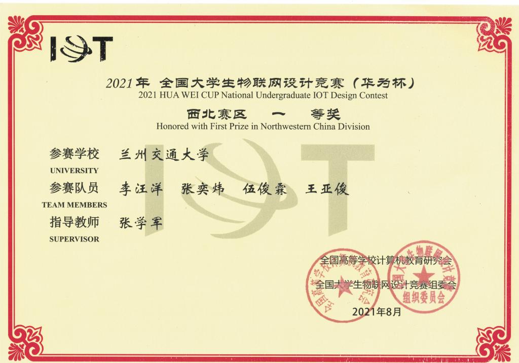 近日,2021年全国大学生物联网设计竞赛(华为杯)全国总决赛在上海紫竹科学园正式落下帷幕。因疫情防控要求,决赛采用学生线上答辩、竞赛评委现场评审的方式进行。经过网上视频答辩评审、作品演示、六强角逐等竞赛环节,我校参赛学生表现优异,由电信学院张学军老师指导的物联网工程1901班的亲善智邦团队获得全国总决赛二等奖,另有6支队伍进入西北赛区决赛,获得赛区一等奖1项,二等奖5项。