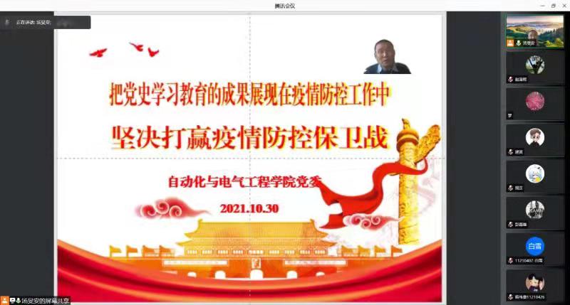 各培养单位党委、团委及时指导建立了临时党、团支部,打破传统线下形式限制,实现党团线上全覆盖,共话抗疫感怀、共抒家国情怀,把稳疫情防控“思想舵”。10月29日,校外4个临时隔离点成立了研究生第一、第二、第三、第四临时团支部,每个临时团支部配备1-2名专职共青团干部作为指导教师,组织开展线上支部工作。10月30日下午,自动化与电气工程学院党委书记汤旻安以视频会议方式为学院研究生临时党支部全体党员讲授了题为《把党史学习教育的成果展现在疫情防控工作中,坚决打赢疫情防控保卫战》的专题党课。