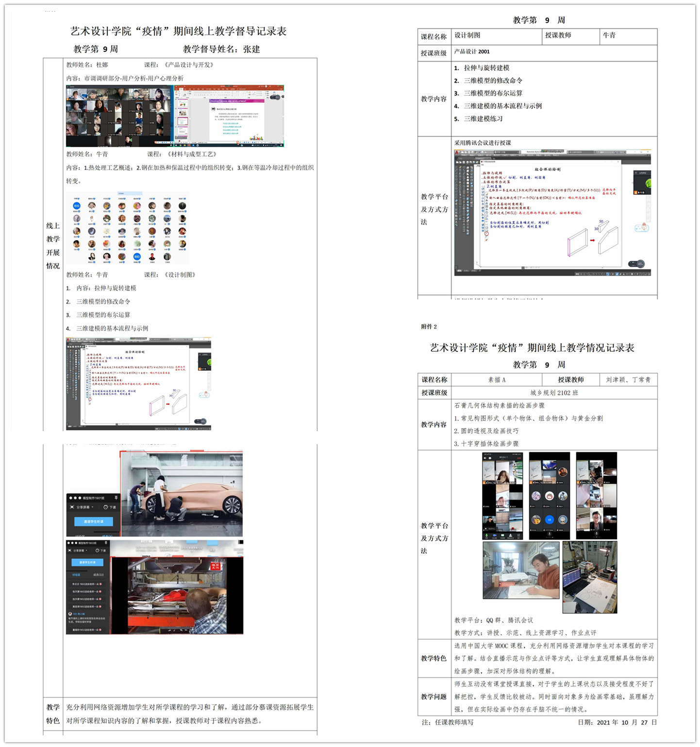 艺术设计学院坚持“一课一策”的线上教学模式,充分结合课程特点,适度增加课堂练习和线上讨论环节,强化课堂交互;增加实操演练、动画、小视频并通过“共享屏幕”分享给学生;作业题设置自我评分环节引导学生提高课程学习成效,同时实行在线教学院级督导周报制度。