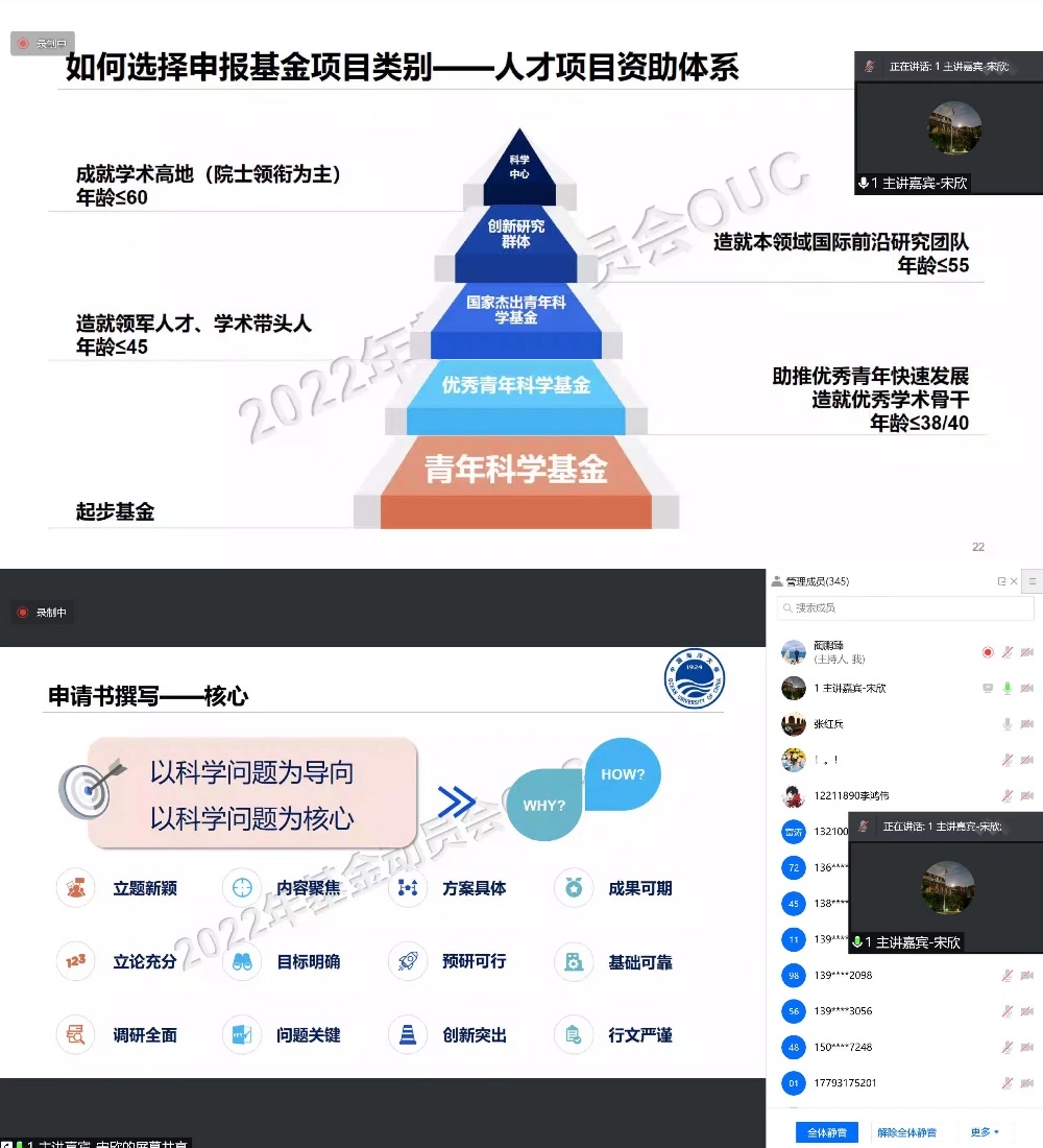会议第二阶段,学校邀请中国海洋大学科学技术处宋欣博士做了2022年国家基金项目申报的辅导报告会。宋欣结合自身多年来的国家自然科学基金项目的管理工作经验,从国家基金申报的新政策、申请和评审流程、申请书撰写等方面做了综合报告。我校340余名教师参与此次线上辅导报告会,反响热烈,极大提高了我校教师申报国家基金的积极性和策略性。