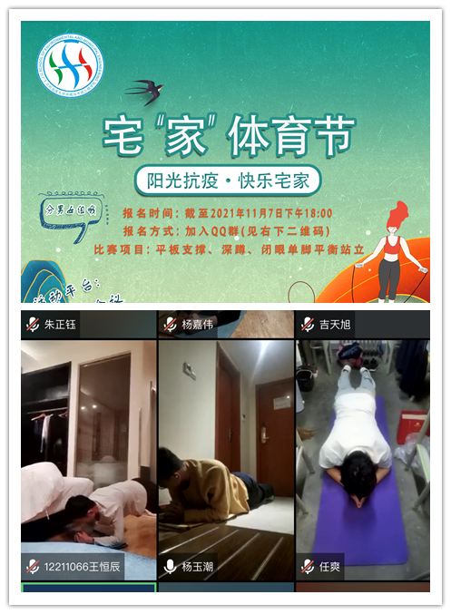 环境与市政工程学院组织了“塑身修行”之“宿生修行”体育节活动,内容包括平板支撑、俯卧撑、仰卧起坐、广播体操等,号召全体同学开展室内体育锻炼,在居家环境中锻炼身体、增强体质,既表达了大家战胜疫情的决心,又促使广大研究生养成积极健康的生活方式。