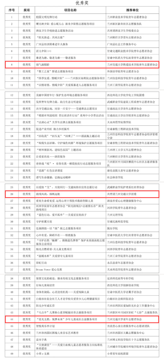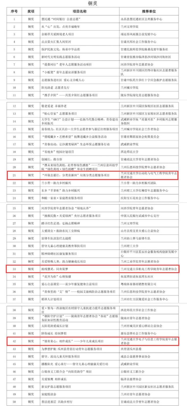我校志愿服务项目通过校内初赛选拔、项目书集体讨论、赛前指导、路演测试、线上模拟答辩等环节,精心筹划、积极备赛,最终机电工程学院青年志愿者协会“不忘初心,情暖老人”志愿服务项目获得金奖;自动化与电气工程学院青年志愿者协会“环保志愿行,分类育新田”垃圾分类志愿服务项目、机电工程学院青年志愿者协会“助残慧灵,同舟筑梦”志愿服务项目、电子与信息工程学院青年志愿者协会 “情寄童心,相伴成长”少年儿童成长项目获得铜奖;铁道技术学院青年志愿者协会“朝气满银龄”志愿服务项目、机电工程学院青年志愿者协会“助残风尚、扬帆远航”志愿服务项目、土木工程学院青年志愿者协会“星光支教,筑梦未来”少年儿童成长公益项目获得优秀奖。