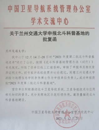 2021年12月21日,我校测绘与地理信息学院李伟博士作为申报单位负责人,成功申报获批“2021年度第二批北斗科普基地”。我校是2021年度北斗科普基地甘肃省唯一入选单位。按照《北斗科普基地管理办法(试行)》有关规定,期间因疫情防控要求,全国26家申报单位统一采用线上汇报答辩,申请书相关资质证明文件的审核以及专家会议现场评选投票并评议通过。2021年12月14日—20日,中国卫星导航系统管理办公室学术交流中心对“2021年度第二批北斗科普基地名单”进行公示。