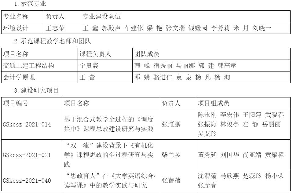 近日,省教育厅下发《关于公布2021年甘肃省高校课程思政示范项目名单的通知》,我校报送的示范专业、示范课程(教学名师和团队)以及建设研究项目等6个项目全部获得立项。2021年,教育厅一共确立了课程思政示范高校6所、教学研究示范中心6个、示范专业30个、示范课程(教学名师和团队)30个、建设研究项目104项。