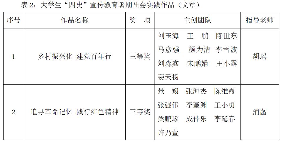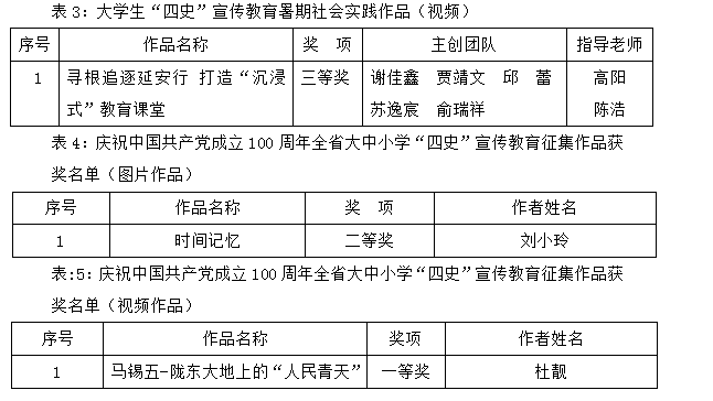 近日,由省委宣传部、省委教育工委、省教育厅联合举办的“庆祝中国共产党成立100周年全省大中小学‘四史’宣传教育作品征集活动”和省委宣传部、省教育厅组织开展的“关于大学生‘四史’宣传教育暑期社会实践作品征集活动”落下帷幕,我校师生积极参与,并取得佳绩,其中荣获一等奖1项,二等奖2项,三等奖3项。