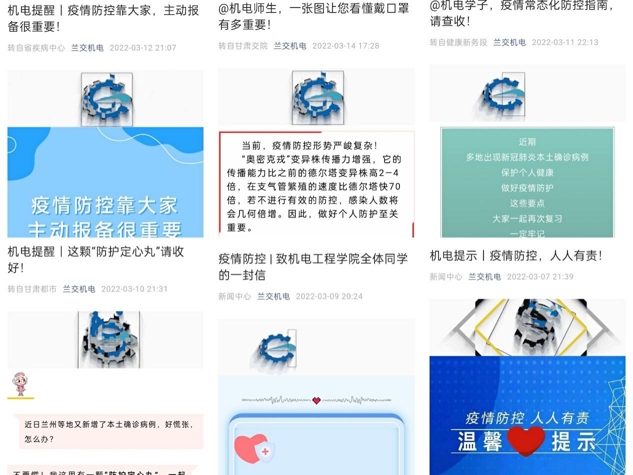 近期,全国新冠疫情多点散发且处于快速发展当中,兰州疫情形势也十分严峻。疫情就是命令,防控就是责任。机电工程学院高度重视疫情防控工作,认真贯彻落实省教育厅、兰州市以及学校疫情防控工作的总体安排和部署,把政策落在最严处,把工作做到最实处,全力保障师生生命安全和身体健康,汇聚领导班子、师生党员、学生志愿者“三支力量”,精心下好“三步棋”,全力筑牢“战疫”安全防线,做好师生健康的“守门人”。