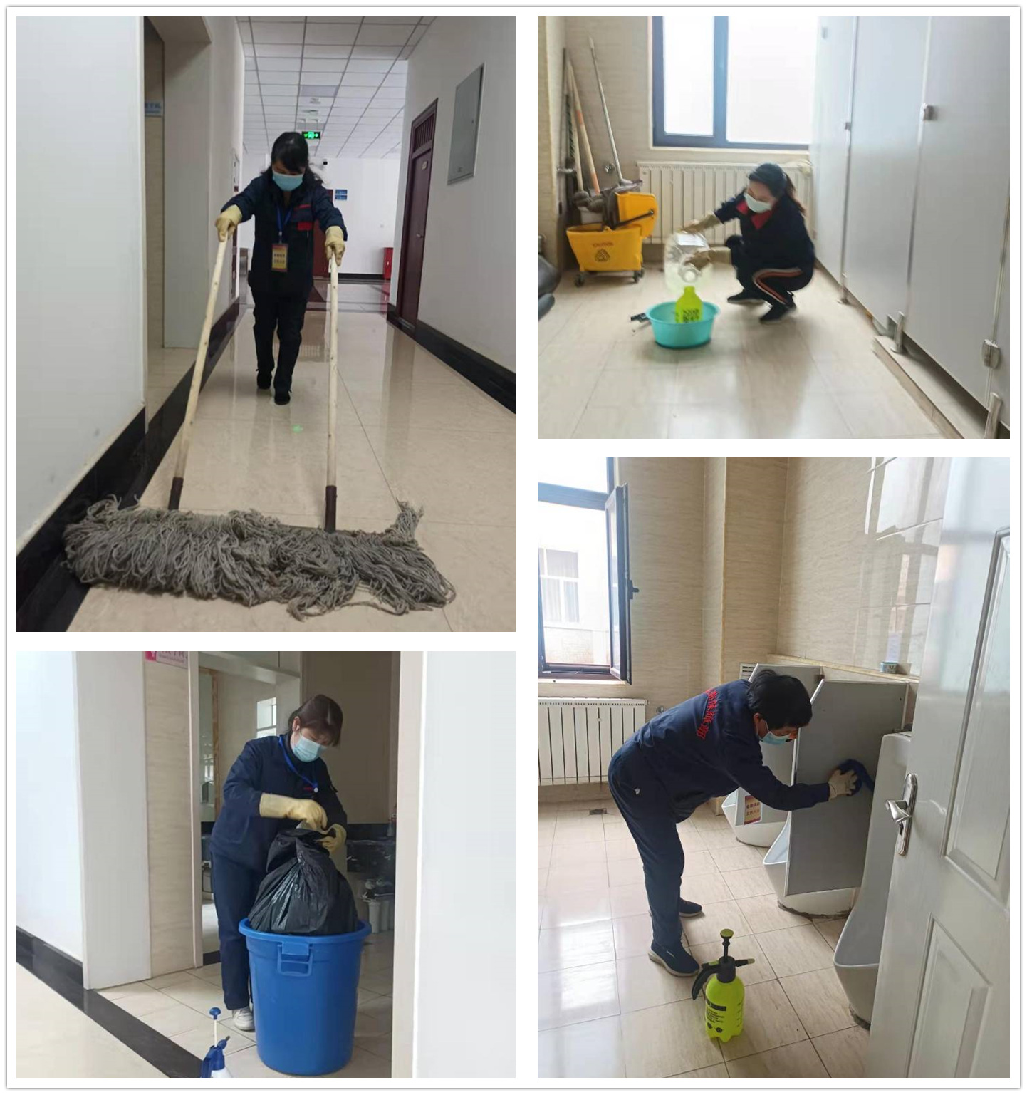 公共用房服务中心张小荣、张凌云、方芳、吴雪萍四人疫情防控期间负责行政楼和尚德楼所有清扫和保洁工作,面对镜头,她们没有多余的话语,只说了句:有啥没做好的,我们再去把它做好。