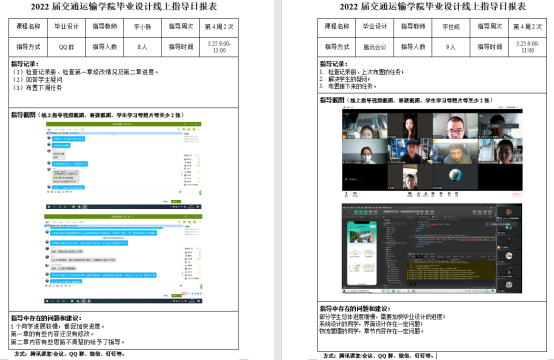 交通运输学院建立了“交通运输学院本科毕业设计线上指导日报告制度”,明确规定了疫情防控期间线上本科毕业设计指导的总体要求和具体安排,要求全体指导教师做到目标明确、任务驱动、保证质量。为确保在线指导标准不降低、设计质量不缩水,学院构建了院领导抽查、主任督导督查、任课教师自查、学生学习调查及学院总结检查的五级督导检查机制,有效保障了在线教学的质量。