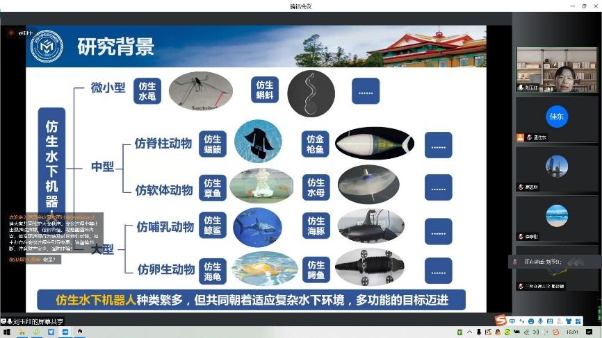 刘玉红基于多样化的海洋探测任务以及复杂多变的工作环境对无人水下航行器性能的要求,结合海洋生物具有速度快、效率高、操纵性好、噪声低等诸多优势的特点,介绍了以海洋生物为仿生对象的仿生水下机器人的研究意义。报告从海洋生物的推进方式出发,综述各类仿生水下机器人的研究进展,最后分享了天津大学智能水下机器人团队在仿生水下机器人研制方面的进展及成果。