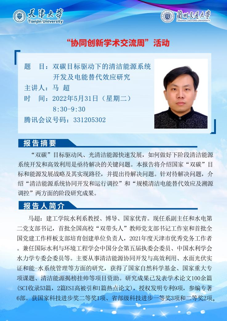 马超:建工学院水利系教授、博导、国家优青。现任系副主任和水电第二党支部书记,首批全国高校“双带头人”教师党支部书记工作室和首批全国党建工作样板支部培育创建单位负责人,2021年度天津市优秀党务工作者。兼任国际水利与环境工程学会中国分会第五届执委会委员、中国水利学会水力学专委会委员等。主要从事清洁能源协同开发与高效利用、水面光伏实证和能-水系统管理等方面的研究,获得了国家自然科学基金、国家重大专项课题、清洁能源揭榜挂帅等项目资助。研究成果已发表学术论文100余篇(SCI收录53篇,2篇ESI高被引和1篇热点论文),授权发明专利9项,参编专著6部。获国家科技进步奖二等奖1项、省部级科技进步一等奖3项和二等奖2项。