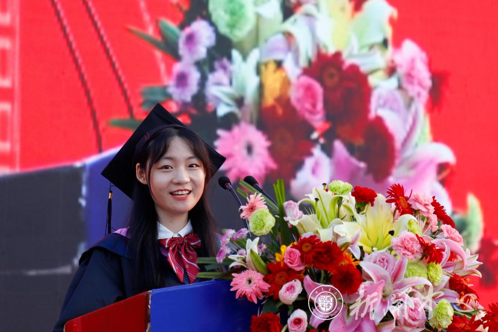 外国语学院赖红玲教授作为教师代表为毕业生送上祝福。她希望同学们懂得感恩,做个有温度的人;学会学习,做个精进的专业人;勤于探索,做个懂生活的人;勇于奋进,做个志存高远之人。她祝福全体毕业生历尽千帆,归来仍是少年。