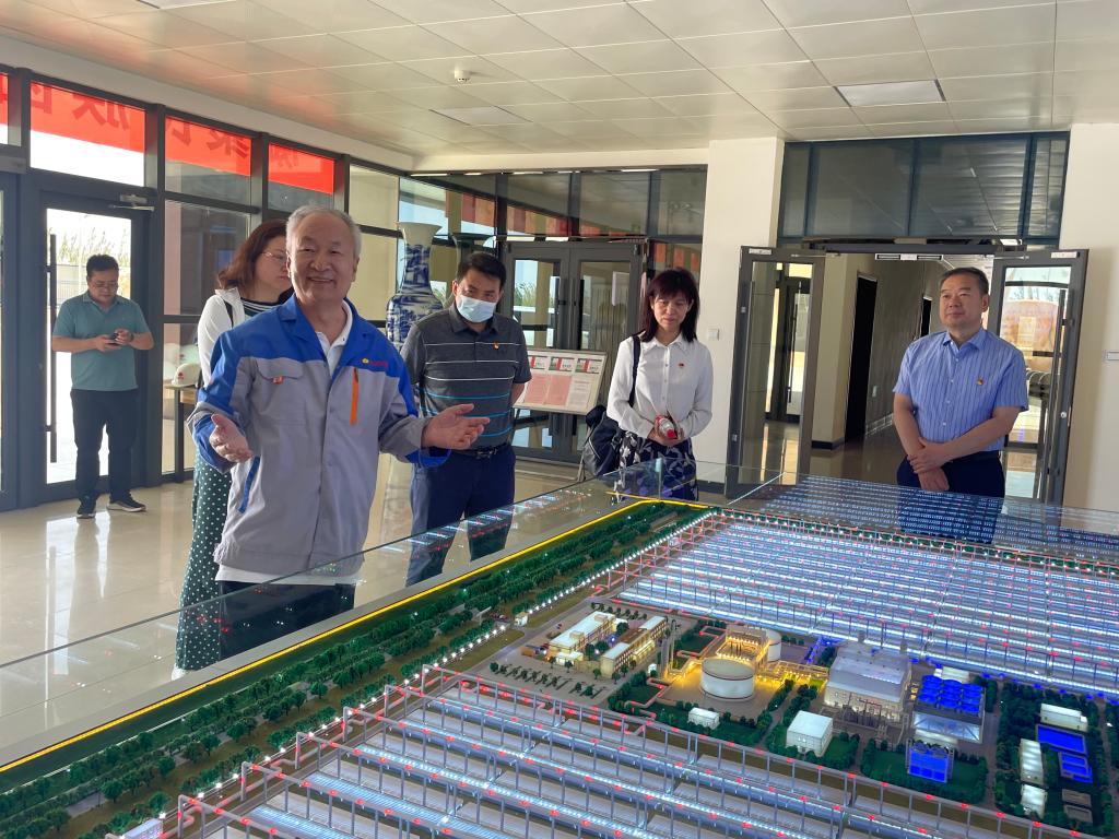 范多旺在沙盘前详细介绍了敦煌5万千瓦熔盐线性菲涅尔式光热发电示范项目建设规模、项目聚光集热技术路线特点、项目建设进展及近期取得成就。
