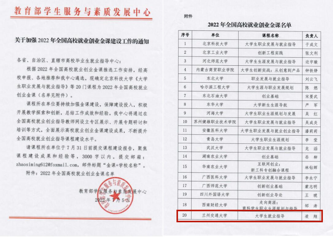 此次全国就业创业金课评选活动从3月上旬开始,各高校申报课程从教学情况、评价应用、课程特色、师资条件等方面对候选金课设置了推荐标准。经过高校推荐、专家评审等程序,我校《大学生就业指导》课程作为甘肃省三所代表院校之一,参加全国就业创业金课遴选。