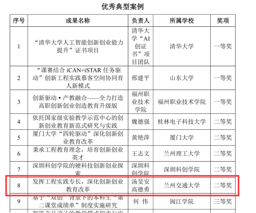 据悉,此次优秀成果评选由中国高校创新创业教育联盟和中国高校创新创业教育研究中心联合举行。成果自2021年10月18日启动征集以来,申报覆盖范围广,申报项目多。经过激烈角逐,共有208项成果进入专家评审环节,涵盖课程、教材、著作、报告、论文、实践、典型案例等众多方面,经过专家库专家评审及学术委员会委员审阅后,最终产生优秀组织奖50个、一等奖41项、二等奖65项、三等奖92项。所有获奖优秀成果拟编辑成册,形成“深化高校创新创业教育改革五周年标志性研究成果”出版。我校也是甘肃省唯一荣获优秀组织奖的高校。