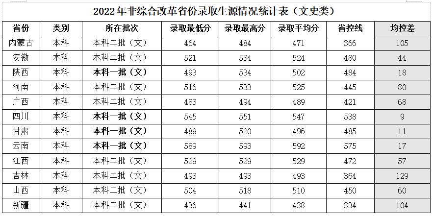 文史类生源中,除去陕西、四川、甘肃、云南实施一本招生外,其他省份均为二本招生,其中内蒙古、安徽、江西录取平均分超过当地一本省控线,生源质量较好。