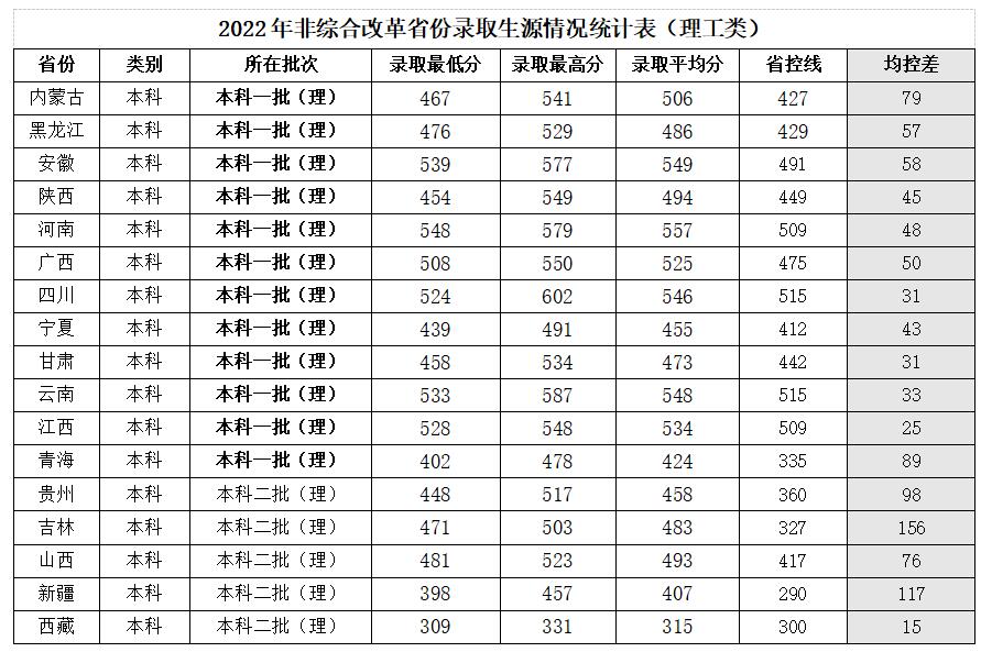 在全国17个非综合改革省份,我校录取情况总体上保持稳中向好态势。其中黑龙江、内蒙古、安徽、广西、青海本科一批(理)录取平均分高出当地一本省控线50分以上;陕西、河南、宁夏本科一批(理)录取平均分高出当地一本省控线40分以上;实施二本招生的贵州、吉林、山西、新疆、西藏五省(区),除西藏外,本科二批(理)录取平均分均高出当地二本省控线75分以上,其中贵州、新疆录取平均分超过当地一本省控线,吉林、山西录取平均分接近当地一本省控线。
