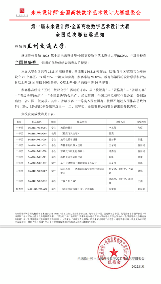 本次大赛作品经过“五轮三级双公示”赛制的评审,从“校级赛—资格赛—省级初赛—省级决赛—全国总决赛”,经过省级、全国二轮拟获奖作品公示,在全国1513所高校164316幅参赛作品中分别决出校、省、国三级奖项。最终,我校获得国家级奖项10项、甘肃赛区一等奖18项、二等奖18项、三等奖22项的佳绩。艺术设计学院李艺萌同学的作品《敦敦的日常》(指导老师刘昭)、曹梦梦同学的作品《地陷救援车设计》(指导老师张建)以及教师组蓝充老师的作品《铃鹿飞天绘卷》获得全国总决赛一等奖。