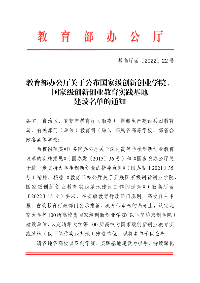 建设国家级创新创业教育实践基地是教育部全面贯彻落实《国务院办公厅关于进一步支持大学生创新创业的指导意见》(国办发〔2021〕35号),深化高等学校创新创业教育改革,加强创新创业人才培养,纵深推进大众创业万众创新的重要举措。教育部今年首次面向全国高校建设国家级创新创业学院和国家级创新创业教育实践基地。经自主申报、专家评审等程序,认定北京大学等100所高校为“国家级创新创业学院”建设单位,认定清华大学等100所高校为“国家级创新创业教育实践基地”建设单位。