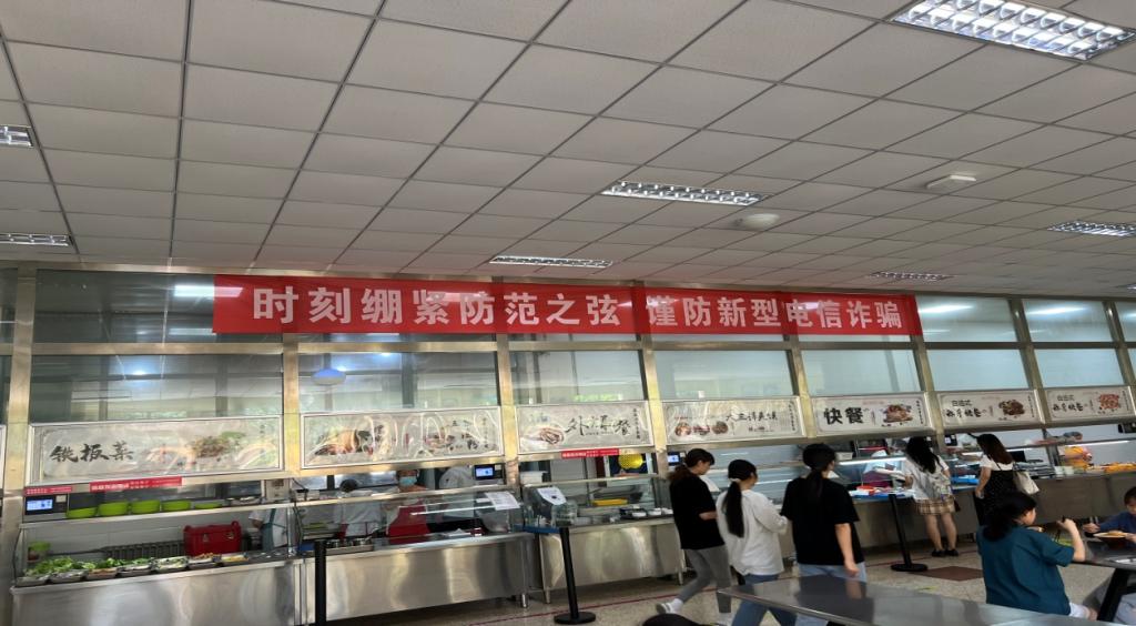 悬挂宣传横幅,餐厅覆盖宣传。充分利用学生餐厅分布广,学生就餐集中的优势,保卫工作部会同后勤保障部,在学生餐厅出入口、取餐窗口等醒目位置悬挂防电诈宣传横幅,实现了学生餐厅防电诈安全提示全覆盖。
